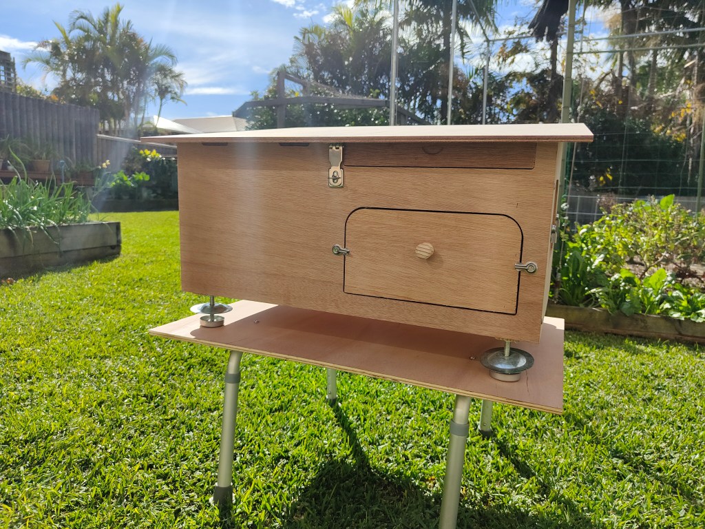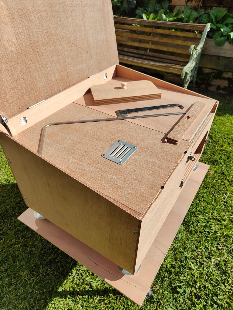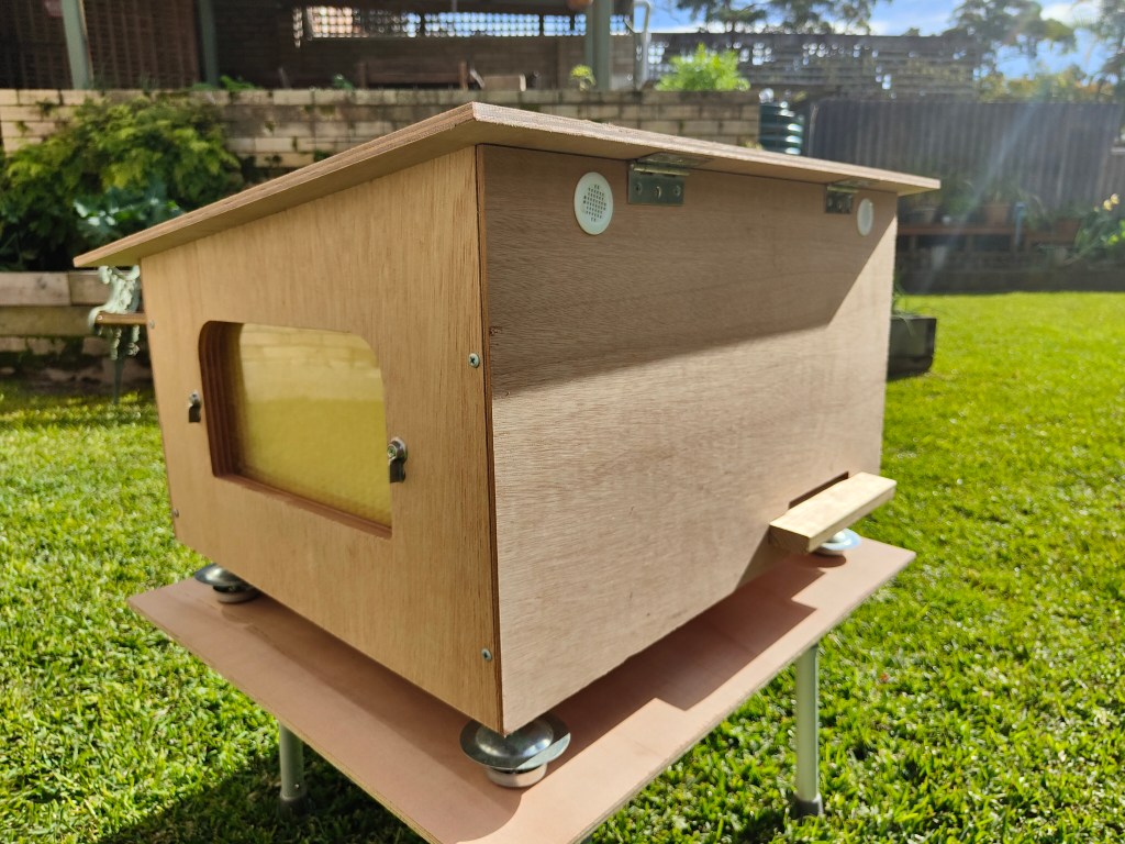 It is made from products designed to resist the elements – marine ply, with all exterior hardware in stainless steel. The entrance landing strip material is treated pine and the hive comes with ant feet (also stainless steel) to stop the hive becoming infested by ants.