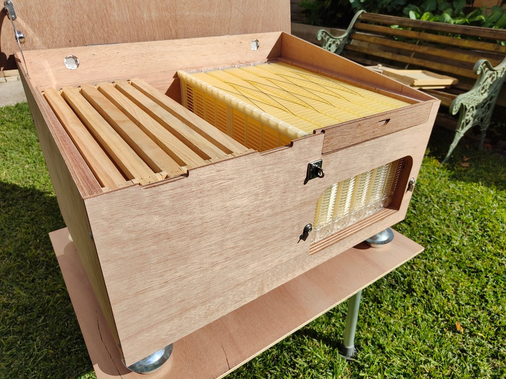 I designed this Horizontal hive with Flow frames incorporated, to enable people with physical limitations or mobility issues to be able to enjoy beekeeping independently. Also, a lot of beekeepers where not aware of just how heavy a box of flow frames full of honey would be, and are struggling to lift off the honey super to attend to the bees in the brood box. This configuration gives them the ability to continue to use the Flow system which attracted them to beekeeping in the first place, while being able to fulfil their obligations to the health of the colony.